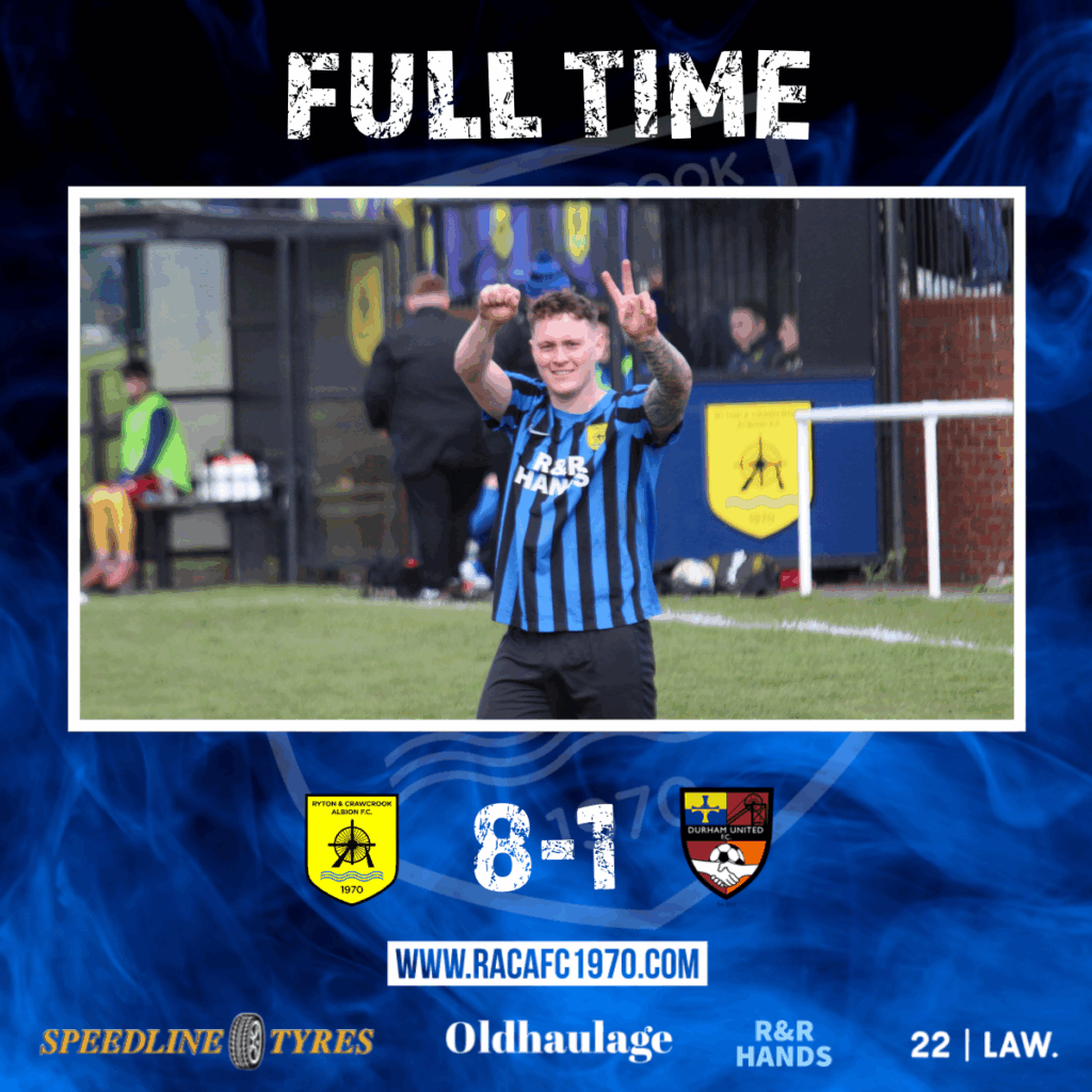 RACA started the second half in full swing & Calvert got his hattrick on 51 minutes after Scott Oldfield found him in space in the middle of the United half. With defenders backing off,Calvert took his chance from 30 yards, the ball swerving a little in the air and sailing past Allen to make it 5-1. 5-1 became 6-1 on 71 minutes when another Oldfield ball forward ended up at the feet of Calvert via a poor header from defender Rees. The Albion no9 hit the post with his initial effort but nodded the rebound home for his fourth of the match. Rees’ forgettable day at the office got even worse when he looked to be harshly given a second yellow card for a challenge on Ryton substitute Joe Groves-Forbes on 80 minutes and Durham’s task became even harder. From the resulting free kick a Nathan Beesley cross reached Groves-Forbes & with half the goal gaping in front of him managed to put his effort over the bar. However Groves-Forbes made amends on 84 minutes when he latched on to an Oldfield cross and slid the ball into the net from close range- 7-1. Ryton and Groves-Forbes hadn’t yet finished with Durham as a move involving Albe Fletcher saw Groves-Forbes net his second goal in 5 minutes to complete the rout & record a second time this season RACA scored eight at home.