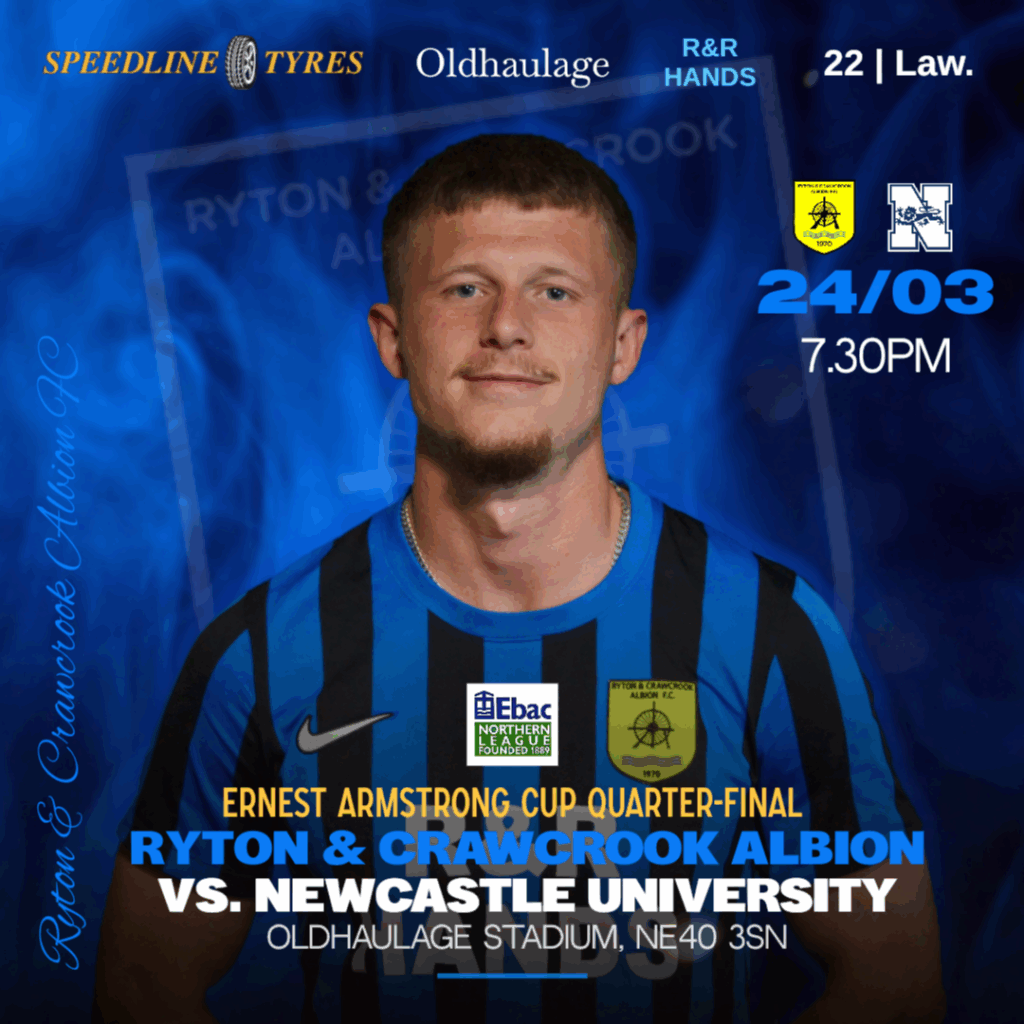 It’s quarter final action at The Oldhaulage Stadium on Tuesday night as Albion face local rivals Newcastle University in the Ernest Armstrong Cup . This is only the second time the sides have met in a cup game, the previous one being the E Armstrong Cup final of 2022 where we won on penalties. With the play offs all but a mathematical dream , this game becomes the most important game in Albion’s run in and with the University still harbouring play off hopes, their priority might well be our league clash at Essity Park on Thursday night. RACA beat Prudhoe 4-1 then Chester-le-Street Town 2-0 at home to reach the quarters, while the Uni beat Boldon 4-1 at Essity Park having received a bye in the 1st round.