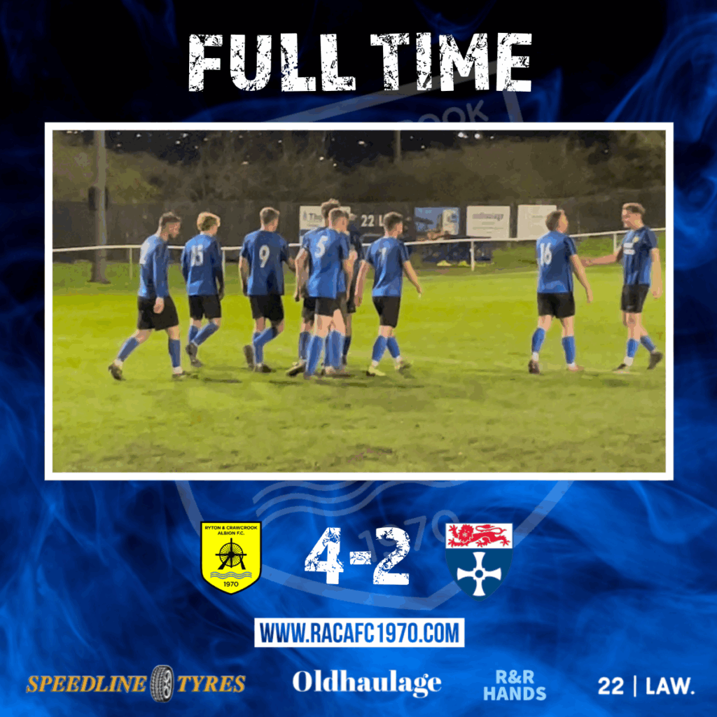 RACA- Corkhill, Beesley, Oldfield (Skivington 76), Fletcher, Hayton, Driver, Dart, Lawson (Hyde 55), Anderson, Johnston (Bewley 68), Calvert (Groves-Forbes 58). Substitute Not Used- Caygill